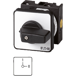 AAN-UIT-schakelaar, Assortiment: AAN-UIT-schakelaar, Typekenner: T0, Met zwarte draaigreep en frontplaat, 4-polig, beschermingsgraad: Front IP65, Bouwvorm: inbouw, Schakelhoek: 90 °, Schakelverhouding: vast, Frontplaat: 0-1, Nom. vermogen AC-23A, 50 - 60 Hz 400 V: P = 5.5 kW, nominale continu stroom: Iu = 20 A, 2 schakelkamer(s), normen en bepalingen: IEC/EN 60947, VDE 0660, IEC/EN 60204, CSA, UL, Lastscheider conform IEC/EN 60947-3