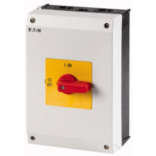 AAN-UIT-schakelaar, Assortiment: AAN-UIT-schakelaar, Typekenner: P1, STOP-functie: NOOD-UIT-functie, Met rode draaigreep en gele frontplaat, Informatie over de uitlevering: Hulpschakelaarcontact of nulleider naderhand monteerbaar., 3-polig, beschermingsgraad: IP65, Bouwvorm: Opbouw, Nom. vermogen AC-23A, 50 - 60 Hz 400 V: P = 15 kW, nominale continu stroom: Iu = 32 A, normen en bepalingen: IEC/EN 60947, VDE 0660, IEC/EN 60204, Lastscheider conform IEC/EN 60947-3