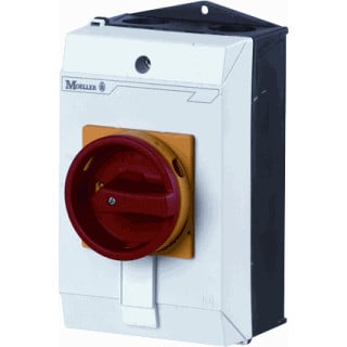 Hoofdschakelaar, Assortiment: Hoofdschakelaar, Werkschakelaars, Werkschakelaars, Typekenner: T3, STOP-functie: NOOD-UIT-functie, Met rode draaigreep en gele plaat, 6-polig, Afsluitbaarheid: Afsluitbaar in 0-stand, beschermingsgraad: IP65, Bouwvorm: Opbouw, Schakelhoek: 90 °, Nom. vermogen AC-23A, 50 - 60 Hz 400 V: P = 15 kW, nominale continu stroom: Iu = 32 A, 4 schakelkamer(s), normen en bepalingen: IEC/EN 60947, VDE 0660, IEC/EN 60204, Lastscheider conform IEC/EN 60947-3