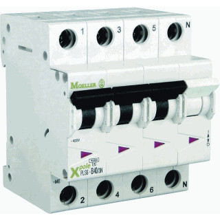 Eaton Industries PLS M installatieautomaat 4, uitschakelkarakteristiek C, nom. (meet-)stroom 6A, meeschakelende nul, 4 polen (totaal), nom. afschakelvermogen EN 60898 10kA, 4 beveiligde polen, spanningstype AC, nom. (meet)spanning 400V, bouwbreedte 70mm, breedte in module-eenheden 4,