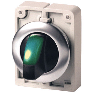 Eaton Industries keuzeschakelaar frontelement, 2 schakelstanden, uitvoering van het bedieningselemen draaigreep, geschikt voor verlichting, bedieningselement groen, bouwvorm lens rond, gatdiameter 30mm, terugverend, beschermingsgraad frontzijde (IP) IP66, met frontring, frontrand metaal,