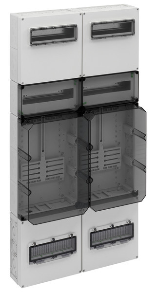 Verdeler voor meter in meervoudige vorm conform DIN EN 61439-2/3, seriematig verzegelbaar, opbouw, componenten in te bouwen conform DIN 43870-1, aansluitleidingen voor meter 5 polig voor TN-S stelsel, toe te passen na toestemming van de energie leverancier incl. toebehoren., Beschermingsgraad IP54/IP65, IK08 - beschermingsgraad IK Code - pictogram, Beschermingsniveau II, 400V AC - Ui doorslagspanning - pictogram, Halogeenvrij, Industrial Quality, 1200 x 600 x 210, 2 metervakken, elk bestaande uit:, bovenste aansluitruimte, 300 mm, voorzien van 35 mm DIN-Rails voor de aftakklem van de hoofdkabel HA25-53 (toebehoren) en consumentenruimte met klapvenster 12TE voor modulaire componenten, incl. schroefloos PE/N-klemblok met telkens 3 schroefbare klempunten, 2,5-16mm², 14 schroefloze klempunten, 1,5-4mm², ruimte voor extra toepassingen, 150 mm, 12TE, voorzien van 35 mm DIN-rail voor extra componenten voor de aanbieder van het net, de meetlocatie of de metingen, met verzegelbare aanrakingsbeveiliging en transparant deksel, metervak, 450 mm, met transparant deksel, voor 1 meter met driepuntsbevestiging, met gemonteerd meterkruis voor draaistroommeter en bevestigingsschroeven, bevestigingsmaten conform DIN 43870-2, onderste aansluitruimte, 300 mm, seriematig te verzegelen, met 5 polig railsysteem, 40 mm railafstand, CU12x5mm, nominale stroom 160A, Icw-25kA(0,2s), railklemmen, voor N- en PE-geleiders, voor CU geleiders 16-35mm², met klapvenster 12TE voor handbediening van de zekeringsautomaten en extra ruimte voor de overspanningsbeveiligingen, leidinginvoer door middel van kabelwartels (IP65, apart te bestellen) of wurgnippel M40 (bijgevoegd)