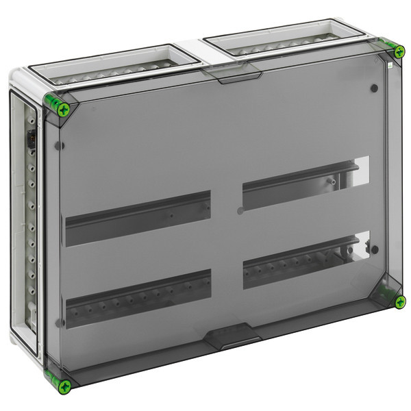 Modulaire verdeler met extra aansluitruimte - industriekwaliteit -, 56 modulen, 4 rijen, Zonder PE/N-Klem, Afdek- en tekststrippen bijgevoegde, incl. 4 x koppelstuk voor behuizingen (GGV), Beschermingsgraad IP65, 56 modulen, Beschermingsgraad IK08, Beschermingsniveau II, doorslagspanning Ui 400V, Halogeenvrij, 640 x 440 x 179, met transparante deksel