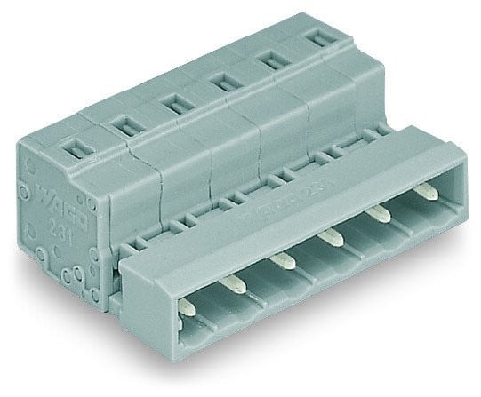 Wago kabelconnector v printplaatconnect., behuizing grijs, contactuitvoering pen, hoek contact/geleideraansluiting 180° (horizontaal), verbindingswijze printplaat naar kabel, uitvoering elektrische aansluiting veerklemaansluiting, aansluitbaar kabeltype ronde kabel,