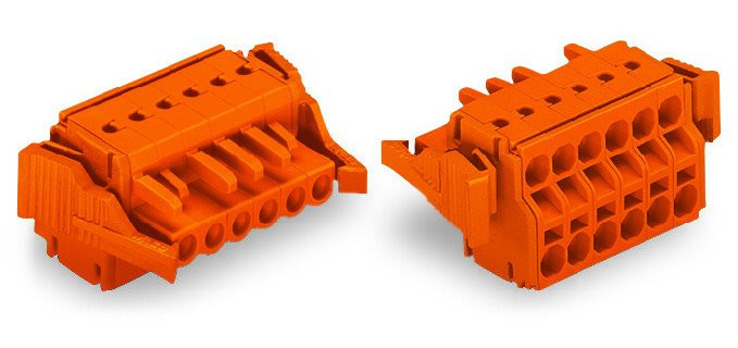 Wago kabelconnector v printplaatconnect., behuizing oranje, contactuitvoering contrastekker (female), hoek contact/geleideraansluiting 180° (horizontaal), verbindingswijze printplaat naar kabel, uitvoering elektrische aansluiting veerklemaansluiting, aansluitbaar kabeltype ronde kabel,